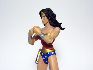 I normally don't buy brand new figures just for customizing, but I couldn't help trying Mickie's arms on my DCUC Wonder Woman. So I popped a bowl of water in the microwave and proceeded to remove their upper body appendages using the "boil & pop" method. After replacing the arms on WW, I could care less about Mickie James. There's an obvious difference in the skin tone, but I decided she looked to cool not to take advantage. I don't have a lot of experience customizing and even less painting skin tones, so the only paint I added was silver for her bracelets (I don't do sculpting, either...yet).