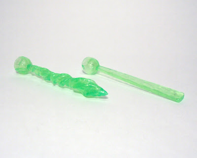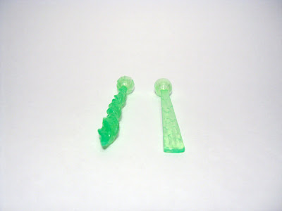 SMC currently has three items in their Emerald Energy series: spiral beam, flat beam and shield constructs. These are meant to compliment Green Lantern action figures (at least the male characters) from the DCUC line, since Mattel doesn't pack too many accessories with the figures. I purchased the Spiral and Flat beams a couple of weeks ago when I ordered the Witching Axe for Faker. I wasn't too into the shield since Katma Tui includes one and it's sort of a lame accessory, so I skipped on the SMC version. But I was very excited about the possibilities for the beams. The Spiral beam interested me the most, but I picked up the Flat beam, too, because I wanted to try them both out and have a different accessory to use.