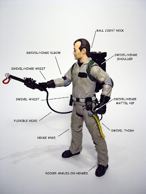 Mattel has introduced several new articulation points with the Ghostbusters line. Not all of them work well and leave the figure lacking in a couple of ways. The head and neck are one piece, moving on what I believe is a ball joint in the chest. Shoulders are standard swivel/hinge joints, however they bypassed a bicep swivel by using a swivel/hinge at the elbow, much like Hasbro's last few Marvel Legends figures. This joint causes the elbow to appear painfully dislocated when the arm is straightened, but when you consider he's wearing elbowpads, it would be difficult to keep your arm straight in real life. The wrist joints work well and are very helpful in getting both hands to hold the wand. I'm sure that because of the proton pack being welded to his back, they decided not to include an ab crunch. Not a big deal as these guys aren't known for the flexibility, but it sure would make achieving different poses a lot easier. The hip joints are very similar to what Mattel uses on DCUC, however, here they are significantly limited by the items hanging on his belt. Thigh swivels have great 360 degree motion, and the hinged knees work perfectly. Pete might have his untucked pant legs, but the sacrifice for this is no calf swivel like the other Ghostbusters. I don't think a cut here would break up the sculpt as it would be the same as the thigh cut, but it seems Matty didn't want to produce four pieces when they could just tool two new lower leg sections. The untucked pants limit the range of the ankle hinge, but manage not to impede the rocker motion too much.