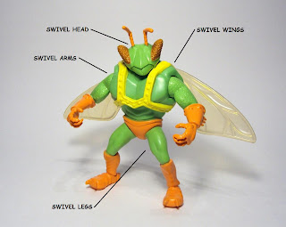 Mattel gave Twitch seven points of articulation, which you can see in the diagram above. The side-to-side motion of his head is limited by his harness. His arms and wings are similarly restricted by the torso sculpt. His legs are the only points that freely rotate 360 degrees.