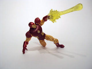 Hilariously, Iron Man can't stand up straight on his stand (remember that lack of rocker ankles?). He leans to the left when you insert the stand's peg into his left foot. Someone hit's the cough syrup early in the morning... The stand is designed to hold the armor cards upright also, so you can display everything in the package on the stand at the same time. The one true accessory Iron Man includes is the repulsor blast. It has an opening that fits over his left fist, mimicking a power blast from the Armored Avenger. It's molded in translucent yellow (hmmm...), with it's base sculpted to look like an explosion of power that trails off into an energy ball(?). It's pretty cool and I will admit it was the second reason I decided to buy this figure, although not to use on Iron Man. You might ask, "What else would you use it for?" Well...