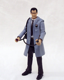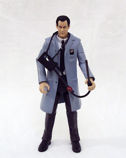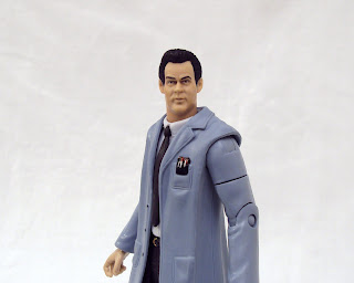 Anyway, back to "I'm not a doctor, but I play one on TV" Ray. This figure borrows the same head from the previous Ray figure, but something seems different. The "skin" has a different finish than the first Ray. It seems painted on on this figure, maybe it's just the plastic used on this one, but it seems to have a matte finish. I don't have the Walter Peck figure, but this figure appears to share a lot of parts with him except for the torso. Ray's torso has glued on tie and doesn't feature a vest (there's irony in that somehow) like Peck. His lab coat is made of a soft, rubbery plastic and is removable. It features some nice details on it, like the breast pocket with the pocket protector and pens. However, in the "Ready to Believe You" scene, Ray doesn't have any pens in his pocket, or a pocket protector. In fact, none of the guys have pens in their breast pockets. Peter has a PKE meter in his and Egon has a large calculator hanging out of his. I'm not sure what the reasoning was behind the pens. I guess they just wanted to add to the "nerdy scientist" look of the lab coats. Also, some of the proportions seem off, like his forearms. They look too long for him and his hands look really huge. Once you remove the coat the torso is comically thin and unrealistic, especially for Ray who is the chunkiest of the 'busters.