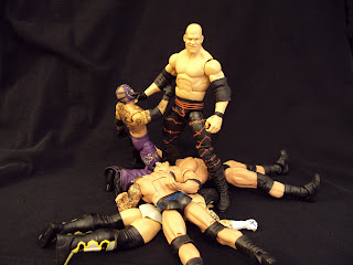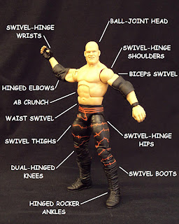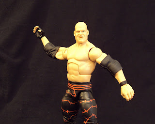 Kane moves pretty well, the main problem being the same as the Undertaker's figure, he can't hold his legs at a full 90 degrees to achieve the "Big Boot" manuever. It's mostly attributed to the shape of his lower torso and the size of his hip pieces. The elbows are somewhat restricted by the larger elbowpads. I plan to pickup the WrestleMania XXVI Basic Kane because he has smaller, less restrictive pads on his arms and I can just swap them out and he also features an angry head sculpt I could just swap with the Elite figure's.