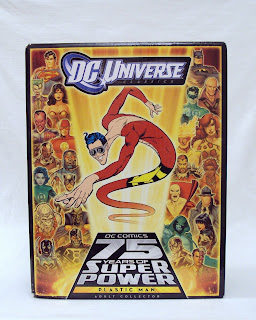 Plastic Man has one of the nicest packages (and I don't feel the least bit ashamed in admitting that) of any action figure, let a lone his DC Universe Classics constituents. The bland, white mailer box is out! In it's place is this beautifully decorated box inspired by Mattel's 75th anniversary of DC Comics package redesign. Plastic Man takes center stage on the front panel of the box over the now standard DCUC cardback image (the back of the box is the same, but adds a "choking hazard" message).