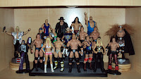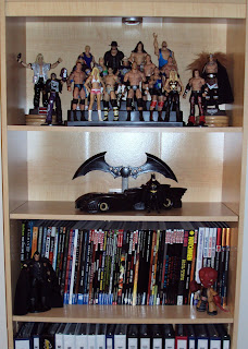 Top Shelf, WWE Elite and Entrance Greats. Middle shelf, the Michael Keaton version of Batman and his classic Batmobile. Holding down the graphic novels are "Ministry of Darkness" Undertaker and HellBoy from the HellBoy II: The Golden Army Mez-Itz.
