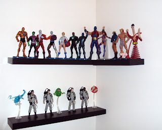 On the wall, top shelf: several B & C-list DCUC figures that usually don't make it to the front row on the main display. Bottom shelf: Finally, the Ghostbusters!