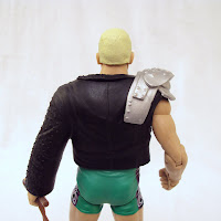 Finlay receives two accessories, the first being this "Mad Max"-inspired jacket he wore during his entrance at WM25's Money-in-the-Bank match. It's molded in pliable black plastic and features silver highlights, mimicking metal armor plating on the right shoulder and details like studs and zippers. The only problem with the jacket is the material chosen to mold it with. Like the Elite Undertaker's coat, the jacket is very stiff and completely immobilizes his left arm. But it does look cool, although makes for a bizarre combination with his green/purple/white outfit.