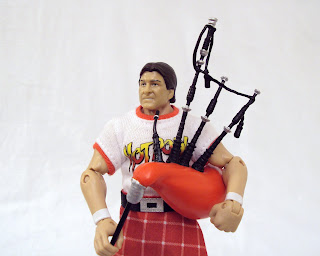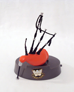 Aside from the clothing, Piper comes packaged with bagpipes. Quite possibly the coolest accessory ever included with any action figure. Yes. It's pretty detailed for it's size, of course, I don't know crap about bagpipes, so I assume it's an accurate sculpt. There's no strap or whatever you would use to carry these, you just pinch the bag under Piper's arm and it stays in place. The other accessory is the standard Entrance Greats musical stand playing a snippet of Piper's entrance theme featuring... yep, you guessed it, bagpipe music! The stand has a switch on the bottom that lets you alternate between the default "demo" mode and an extended version of the music. It's activated by a small button on the right side of the base. Unlike the EG Triple H and Y2J, which feature a decal specific to the appearance they made in the given attire, Piper's stand features a WWE Legends decal. You may notice the one on my figure's base is crooked. Them the breaks, I guess.
