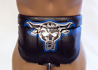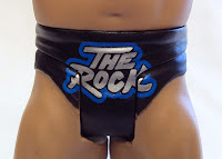 As is tradition in the Entrance Greats line, once you strip off the elaborate attire, you have the wrestler is his more common ring attire. The Rock includes his black wrestling shorts, this version featuring his trademark "Brahma" bull and "The Rock" logos in silver with blue trimming. The tampos are clean, but because of the articulation (again, more on that in a moment) are chopped up on the sides, requiring you to put the legs in a certain angle to line up the logos properly.