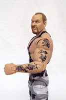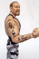 While Mattel's done a great job on adding body art to their WWE figures, I'm a bit disappointed with the tattoos on these two. First the paint used seems too dark, something I've heard they've improved on in the latest waves of "Elite" figures. Also, the images aren't as sharp, but that may be caused by the choice in color. Obviously, they're just copying what the wrestlers have, but something didn't work out too well on these two.