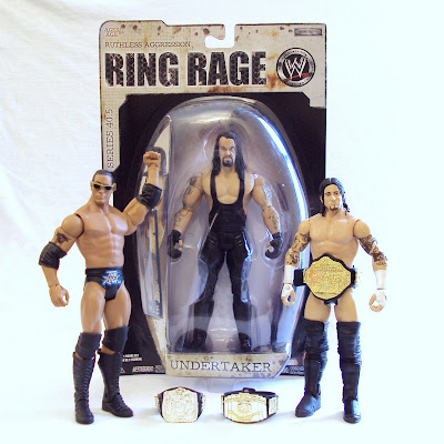 No less than three action figure-sized title belts from various Jakks Pacific WWE lines. The belts are: WWE World Heavyweight Championship, classic Intercontinental Championship and one World Tag Team Title.