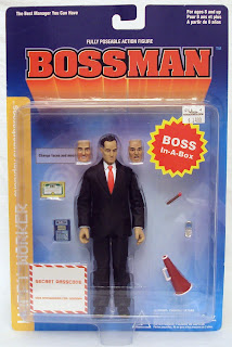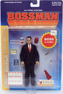 Bossman features loads of "real-life" accessories, plus three swappable face plates each with a different expression: happy, angry and serious. The second, "exclusive", figure features the same accessories and face plates, the only differences being the happy and angry faces are repainted in clown and devil make-up, respectively.