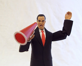 The accessories are mostly comical, playing up to various "boss" cliches. Some of the pieces are difficult to use due to the limited articulation, but you can more or less achieve a pose that makes sense for each accessory. The megaphone pictured above let's him properly motivate his subordinates.