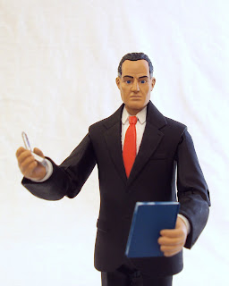 Bossman's articulation leaves a bit to be desired, then again, it's a guy in a business suit, he doesn't really have many "action" poses to begin with. There's a ball-joint in the neck (restricted by his hair and face), swivel/hinge shoulders, hinges at the elbows and knees, and swivels at the waist, wrists and hips. The shoulders move well, as do the elbows and hands, but the overhang of the jacket obscures the waist and hip movement.