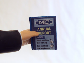 An "Annual Report" gives him all the information he needs to know. There's also a plaque celebrating his many accomplishments.