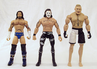 Here's a comparison of Charly with CM Punk from Mattel's Elite Collection and Brock Lesnar from Jakks Pacific's UFC line. Malice is billed at 5'9", making his figure more in-scale with Lesnar. But just like Jakks UFC (and presumably TNA) figures, all the luchadors in the Lucha Libre USA line are basically built using the same body and therefore the same height.
