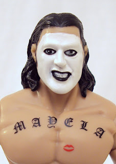 Charly has an adequately muscled physique for a professional wrestler. The lower body is mostly smooth since he's wearing tights, but there is sculpting on the inside portion of his boots. Malice has several tattoos on display around his body. I can't really make out what his upper arm tats are because they're printed in a thick black ink without much definition. The rosary on his right bicep is printed with much better detail. The letters on his chest are printed cleanly, although I can't seem to make out the word. They seem to spell "MADELA", but I have no idea what that means. There's also a kiss imprinted just below the word on his chest using red paint. I guess old Charly's a ladies man. Isn't that kind of anti-Goth?