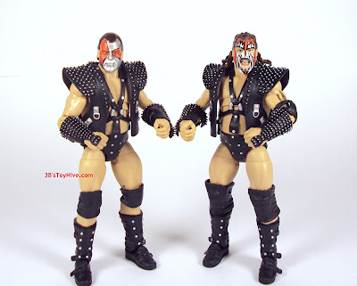 Demolition's action figure debut comes to us individually packaged in series 4. Both figures are built using the same torso (previously seen on Nikolai Volkoff and "Hacksaw" Jim Duggan), but feature different legs. The different legs create a height difference between the two characters and is the only area of these figures that have created a bit of controversy. You see, the real-life Ax and Smash have a roughly 1" height difference. Now notice Smash's figure is a bit taller than Ax, therein lies the problem. Ax should actually be the taller of the two figures.
