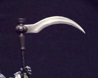 Like most of DC Direct's figures (and just like the rest of the Blackest Night series), Nekron is packaged with a display base (pictured in the articulation diagram above). It features Nekron's preferred lantern faction's logo and one peg to lock him into place sculpted on the top. The base is molded in transparent black plastic with white paint making out the logo. His true accessory is his black lantern/scythe weapon. The scythe features a curved staff sculpted to look like wood with a straight, wrapped handle.