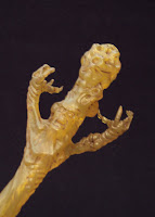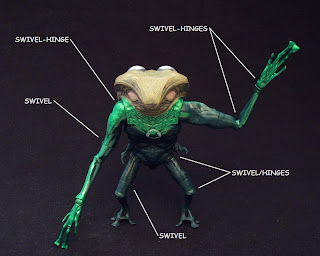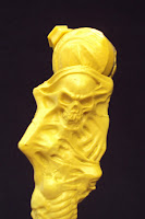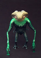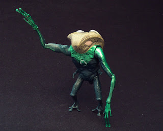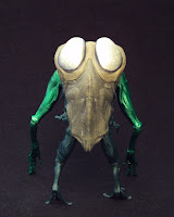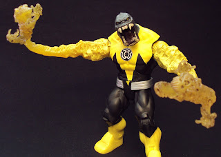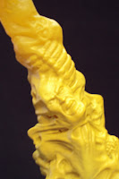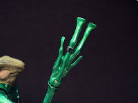 The Parallax tentacle features lots of detail throughout, with tortured faces and skulls pushing through it's "skin" and ending in triple serpent-head. It's molded in a transparent yellow rubber with a flexible metal rod running through it. The tentacle is painted with thick yellow paint on it's base near the connector joint, then fades off revealing the clear yellow rubber. A dark wash is used on the serpent heads to bring out the details of the sculpt. It's genuinely fearsome in appearance and I really can't wait to see what Parallax will look like when completed. You should note that this tentacle is identical to those included with Hal and Tomar and apparenlty will also come packaged with Naut Ke Loie and probably Sinestro. I hate the fact it will take several months (at least) to complete him because I want to put him in my Sinestro Corps display right NOW! Until then, I'll just have to imporvise...