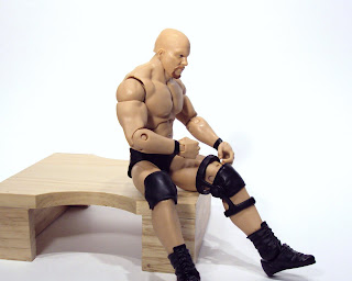 Austin is a rather generic looking wrestler. He's about average height for a pro-wrestler, he's bald, only wears black trunks, black kneepads with a brace on one leg (later he wore two and later-er (?) he wore two red braces), has short black boots and that's pretty much it. He seems to have a new torso sculpt. It's about the same size as the Elite Batista or Triple H torsos, but not as toned. I think this torso would have benefitted the DiBiase (Jr) and Randy Orton figures, too. However, the neck seems a bit too large for Austin, since his neck isn't that wide. He definitely has new lower leg sculpts to accomodate his smaller boots which appear to be new to the line as far as I can tell. The kneepads and knee brace are separate pieces that fit over his legs, pretty much a standard feature on all Mattel WWE figures.