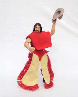 Disregarding my disdain for the cowboy look, I will say that Mattel's dedication to delivering great figures continues with the accessories included here. Terry's cowboy hat is molded to fit his head specifically. The shirt is basically a piece of cloth with a hole in the middle to fit Funk's head through. It looks correct to the images on the package. The chaps, even though completely tacky and absurd, are impressively constructed. Mattel used a faux leather material for the main parts, adding red silky frills all along the seams. The chaps stay on with the help of elastic bands at the waist and knees.