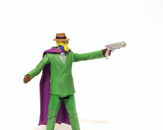 He's built on the Question's body from wave 11, but instead of the one piece jacket/coat combination, Sandman receives a new double-breasted jacket using the same soft plastic. It hinders some of his torso articulation, but seems more flexible than the pieces used for the Riddler in wave 5 and Two-Face in the "Gotham City 5" set. His cape is a bit lighter than the Atom's, probably because it's, ironically, shorter. Sandman's paint is well-done, too, the only issue I found was a bit of blurring where the yellow on his mask meets the blue area, but it was very minimal. The pinstripes on his tie are clean, which is nice since they're two-tone. Like the Atom, Sandman uses some brown paint to create a leathery look on a couple of his costume elements, specificially the gloves and shoes.