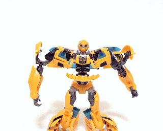 He features one accessory: a double-barreled blaster that plugs into either of his forearms. The weapon is also designed to fit beneath his car mode, but I think I wore down the tabs on mine because it doesn't stay in place in that mode. It would have been nice to get two of those for each arm. The sections below each headlight that slide down were REALLY tight when I first removed Bee from the box. It took some leveraging with the dull side of my Exacto knife to pry them open. I'm able to open them now using only my hands, but even then they're still a bit tight, especially the one on the right side. My only real complaint with Bumblebee's robot mode is the Autobot symbol on his chest is obscured due to the outer hood/front-end sections. I think that won't be an issue with the standard line release because it features a smaller logo.
