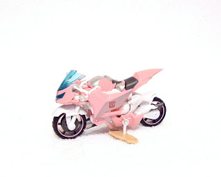 TransFormers Prime Arcee's alternate mode is a motorcycle, or sport bike. This version features a pink and white deco inspired by her original, "G1" colors and was the primary reason I wanted this set. I figured she'd fit in nicely with my "Classics" TF collection. More on that later. In her motorcycle mode, she's out of scale with Bumblebe and the human figurines. I like the design of the bike and thankfully the bladed weapons are removable while in this mode.
