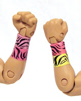 Something that continues to bother me a bit about Mattel's wrist decos is that while just painting on wrist tape is fine for wrestlers who use it, the same technique isn't as effective when it comes to wristbands. Sure, tooling new forearms just to add wristbands would be counter-productive (from Mattel's point-of-view), but they could have solved the problem just like they did with the boot sleeves. Molded them out of rubber and then paint them, allowing Mattel to slip them over the wrists in production. That doesn't seem to difficult and may be a good point to bring up to their design team.