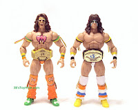 Bret Hart in the "Defining Moments" line. After the match Warrior held both titles. He had several customized versions of the WE belt with different color straps, including: white, blue and light purple. But he did not have one with a yellow strap. Only his IC belt featured a yellow strap. I assume adding two belts in the package wouldn't "cost out" for the series' budget, so the design team apparently decided that merging the two styles into one belt was the best option. While I'm glad WM6 Warrior wasn't thrown into the "Defining Moments" line, that route would have yielded both belts, on the correct straps, with the vac-metal finish. But the better alternative would have been a new, slightly smaller mold of the classic IC belt on a yellow strap, with or without the vac-metal. Considering this figure is specifically based on his entrance at WM6 (by the end of the match most of his body paint was gone), it would have made more sense.