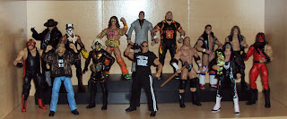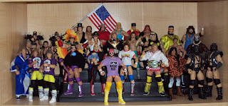 Eventually the display ended up being only Legends, or Superstars, from the '80s and '90s. Some wrestlers blurred the line between the two decades and some (like the Undertaker and Shawn Michaels) had several different looks during the same time period. I decided to go with one version of each Superstar and made the top shelf mostly figures from the 1980s and the second shelf figures from the 1990s.