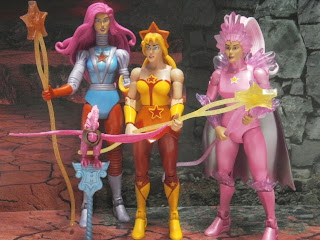 Starla is the leader of the Star Sisters.  She's predominately yellow, orange and reds and seems to share her colour palette with a shaolin monk.  She supposedly shares the 2.0 MotUC female buck and the waist twist is obvious, but there's some sort of error with the hip pieces.  Fortunately, she has a skirt which covers up that defect.  She has all the usual articulation - rocker ankles, calf twists, knee bends, hips, waist twist, neck, shoulders, elbows and wrists.