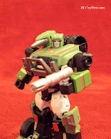 Thanks to Dr. Wu, Hound receives his classic G1 weapon (this one, not this one, which doubled as a rear-mounted cannon when in vehicle mode) and now has something to use against his pack-in enemy other than a holographic projector. It's constructed in the same fashion as Ravage's missiles, but since it's faithful to the cartoon weapon's appearance, is must simpler in design. Interestingly Dr. Wu made the blaster's handle rectangler instead of cylindrical, yet it fits perfectly in either of Hound's fists. The most intricate detail on the weapon is it's barrel, which is hollow at the end and has a slot cutting into it horizontally. They could have just glazed over this detail, but I'm glad the crafted it correctly to the source material.