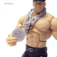 DM Cena also includes a necklace that would make the Junkyard Dog jealous. It's molded in a solid color without any paint apps, however the sculpting on the medallion is deep enough to produce enough shadows allowing you to appreciate all the details. It does not, however, spin like Cena's real-life medallion. My main problem is that the necklace is kind of stiff and doesn't permit the medallion to hang properly. Instead it tends to jut out and off of the figure's chest. I cheated a bit in a couple of my pictures by tucking the medallion behind the championship belt.