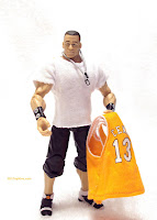The cloth elements of his costume are well-made. The t-shirt works like the others we've seen in the various WWE collector lines from Mattel, using a velcro closure on the back. I was surprised to learn that the t-shirt and basketball jersey are separate pieces. The jersey fits over the figure's head and can be a pain to remove and put back on. I'm glad they're two different pieces, though, because it opens up your display options.