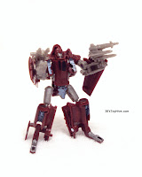 Powerglide's payload in airplane mode are made into handheld weapons when he's in bot mode. Each equate to not much more than clusters of missiles he holds in his hands, but they still look intimidating. I was surprised to see that each set actually fold in half to form his blasters, that seems to be more of a Deluxe figure trait.