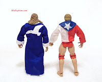 If you own Texas Tornado, you already know what to expect from the Von Erich-version of Kerry; it's the exact same sculpt right down to the large knee pads, but without the boot tassels. The difference is in the paint decos and the accessory. On this figure, Kerry is sporting a full blue robe with a white trip and a bird silhoutte printed in white on the back. The robe utilizes a simple velcro closure on the front.