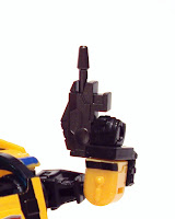 The "Growing Pains" kit consists of the Goldbug head and two blaster pistols. Like the "Devil Horns" head, this one consists of three parts held together by a single screw. You don't have to disassemble the head to fit it on to the WFC Bumblebee neck peg. The peg is sturdy enough to stay intact while you yank the old mug off the figure and snap in the new one, however, I wouldn't recommend swapping them frequently as it could cause some breakage.