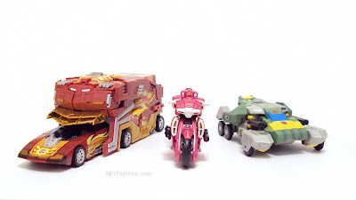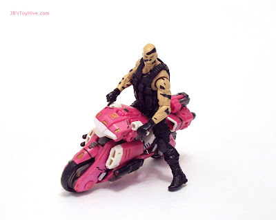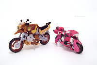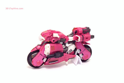 The conversion process isn't overly complicated but a few spots can lead to some aggravation until you're used to the various joints involved. For the most part her legs split apart then bend at the knees to form the front and rear wheels. Her head tucks away into the torso, while the arms line up side-by-side behind her. The torso turns to line up with one of the wheels (at this point, it doesn't really matter which way). One that's done, you pretty much have her in motorcycle mode and only need to put away the accessories and plug in her side panels to finish her up.