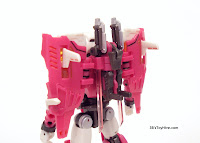 For the vehicle mode, the swords fold at the hilt and fit into the slots where the fins stick out of on the wings when she's in robot mode. The barrel of her rifle retracts into the "cannon" portion and that piece fits between the bottome edges of the side panels. Evertying else is either stored internally or plugs on to the arms to form the seat and rear portion of the motorcyle. The pegs that held her robot wings flip out to form the motorcycles handles.