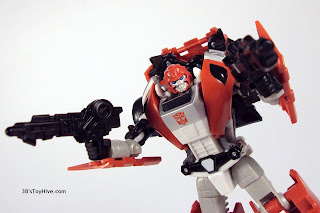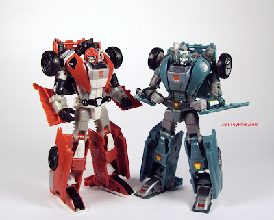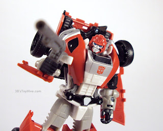 Swerve was a mini-bot in G1 and just like Wheelie, he became a Deluxe-sized figure in the GDO series. That doesn't bother me in the least. I don't care much for mini-bots, unless their alt-mode is supposed to be smaller than the deluxe-sized vehicles. If he were to transform into a scooter or go-cart, then I wouldn't be bothered with having him as a Scout-sized or similar mini-bot.