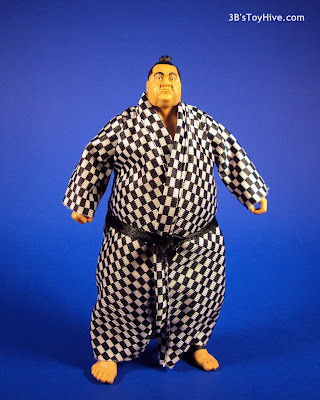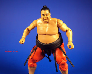 Mattel's tackled several super-heavyweights before, but Yokozuna posed a unique challenge because the sumo wrestler thing isn't just a gimmick. You can get his stats at his Wikipedia page. With dimensions like those, Mattel couldn't rely on nearly anything from their existing parts library. Yokozuna is a nearly 100% new sculpt. The reused parts can be found in his arms and possibly the feet. Otherwise everything's been built for him. The sumo belt is a separate piece that's been glued in place and features some dangly bits along the front.