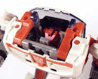 Once on, the head fits perfectly into the chest cavity without disrupting Red Alert's conversion to vehicle mode.
