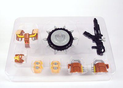 The kit consists of eight pieces: 1 head, 1 chest armor, 2 spiked shoulder pads, 2 spiked knee pads, 1 spiked wheel shield and a blaster. All the pieces are packaged on a transparent plastic tray within a small black box. The entire kit is made of plastic molded & painted in the appropriate colors, which are matched to the Wreck-Gar version of the mold.