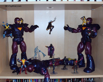 Anyway, the new display is occupied by my "modern" WWE display and diorama featuring the X-Men fighting a squad of Sentinels. Some of the changes I've made to my WWE figures include: new lower legs and knee pads for Big Show, head swaps on Sheamus, Randy Orton and ADR, trimming CM Punk's knee pads and removing Rhodes'.
