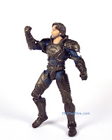 He has a ball-jointed head (limited by his hair), swivel-hinge shoulders (limited by the armor and cables), swivels at the biceps, wrists, waist and thighs, hinged elbows, knees and ankles, and "Mattel hips". I can live with most of the articulation featured here, but the lack of ab and rocker ankles is detrimental to a figure like Superman which should ideally be able to achieve a flying pose.
