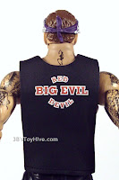 The shirt is adorned with a large red devil head outlined in white. The back of the shirt reads "RED DEVIL; BIG EVIL" on the back and was similarly applied with red paint and a white outline. I haven't had any issues with paint rubbing off the molded t-shirts or vests in the line, but I can't imagine they would withstand too much abuse, so take care in storing and handling these.