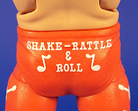 We'll start off with a look at Honky's entrance attire, something which no doubt put a strain on the budget for series 21, but nonetheless there are couple of things missing. Most obvious is the ommision of his belt and I don't mean the IC title belt. I mean the cummerbund he wears over his jumpsuit. Mattel's design team noted that they initially wanted to make it a separate piece, but they were already over budget with HTM, so instead there was a running change that painted the belt directly on to the jumpsuit. As of this writing I have yet to see any of the 2nd run Honky's online, so I have no idea how that turned out.